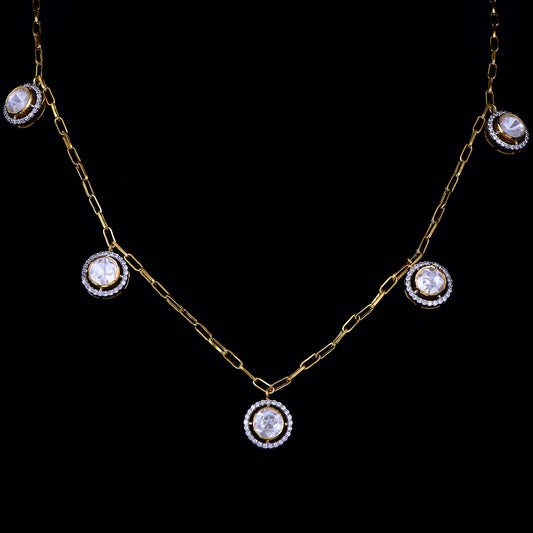 Elegant and radiant, The Five-Halo Polki Chain is designed to add a graceful sparkle to your jewellery collection. Crafted in 92.5 sterling silver and finished with a luxurious 18K yellow and white gold polish, this piece features beautifully set moissanite polki arranged in five delicate halo motifs that create a...