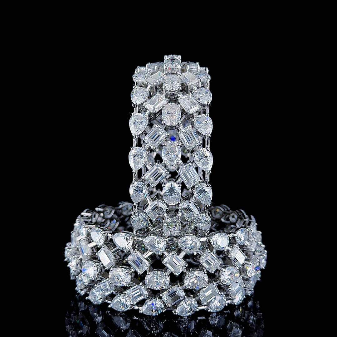 Bold and magnificent, The Royal Diamond Bangle is designed to be a true showstopper. Crafted in 92.5 Australian sterling silver and finished with a luxurious 18K white gold polish, this statement bangle is adorned with stunning fancy-shaped moissanite diamonds, including emerald cut, oval, and pear shapes, beautifully arranged to create...