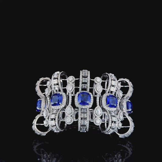 Designed to command attention, the Royal Sapphire Bracelet is a striking statement piece crafted in 92.5 Australian sterling silver. It is beautifully adorned with lab-grown blue sapphires and brilliant moissanite diamonds in a mix of round, pear, and baguette cuts, creating a rich play of color and sparkle. The bracelet...