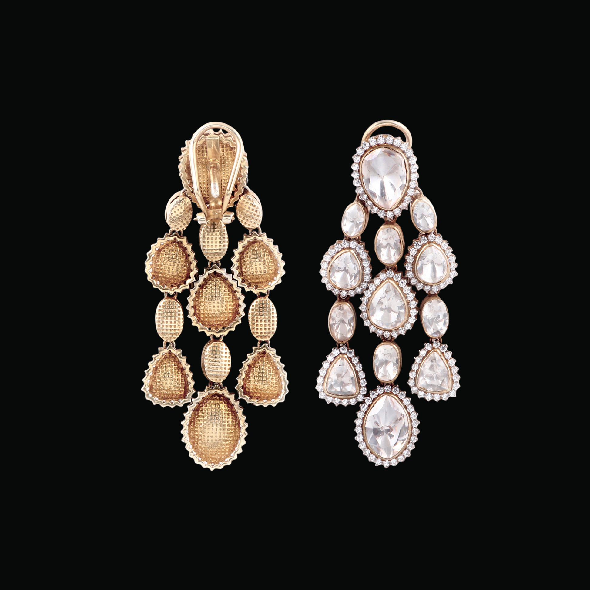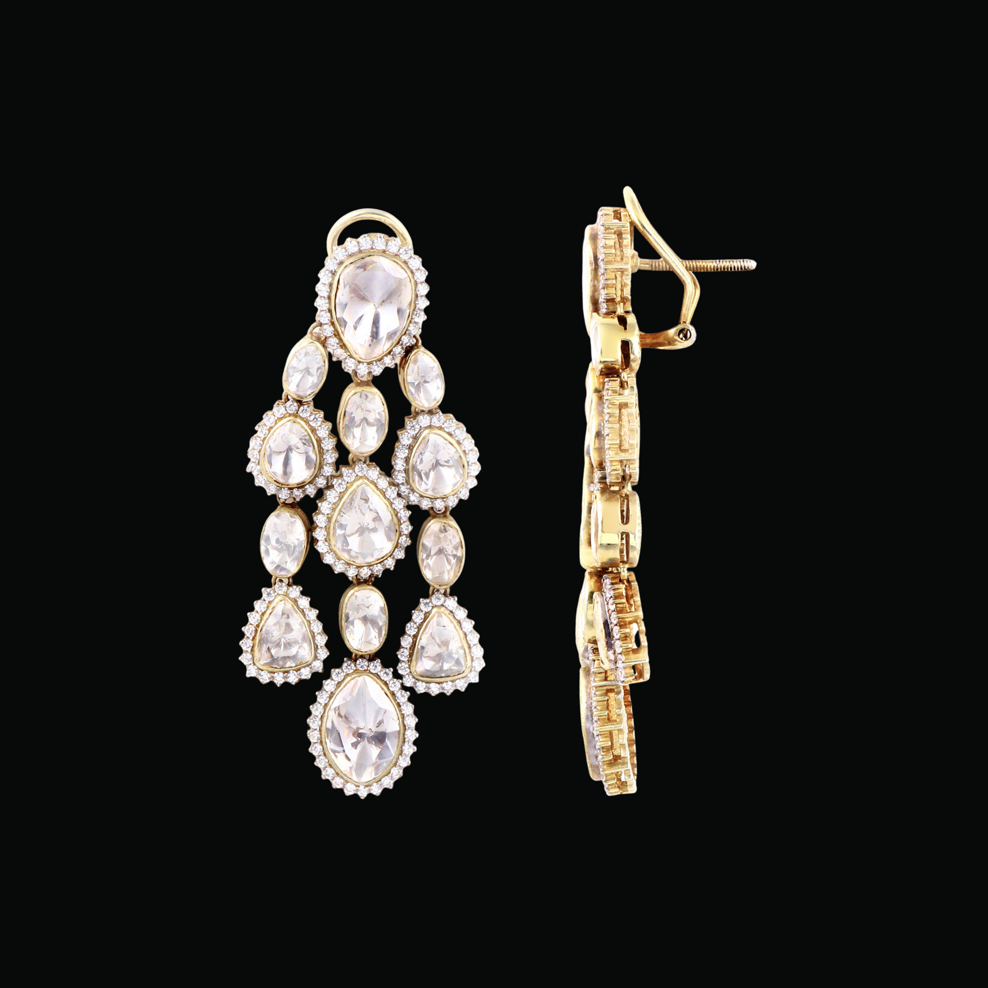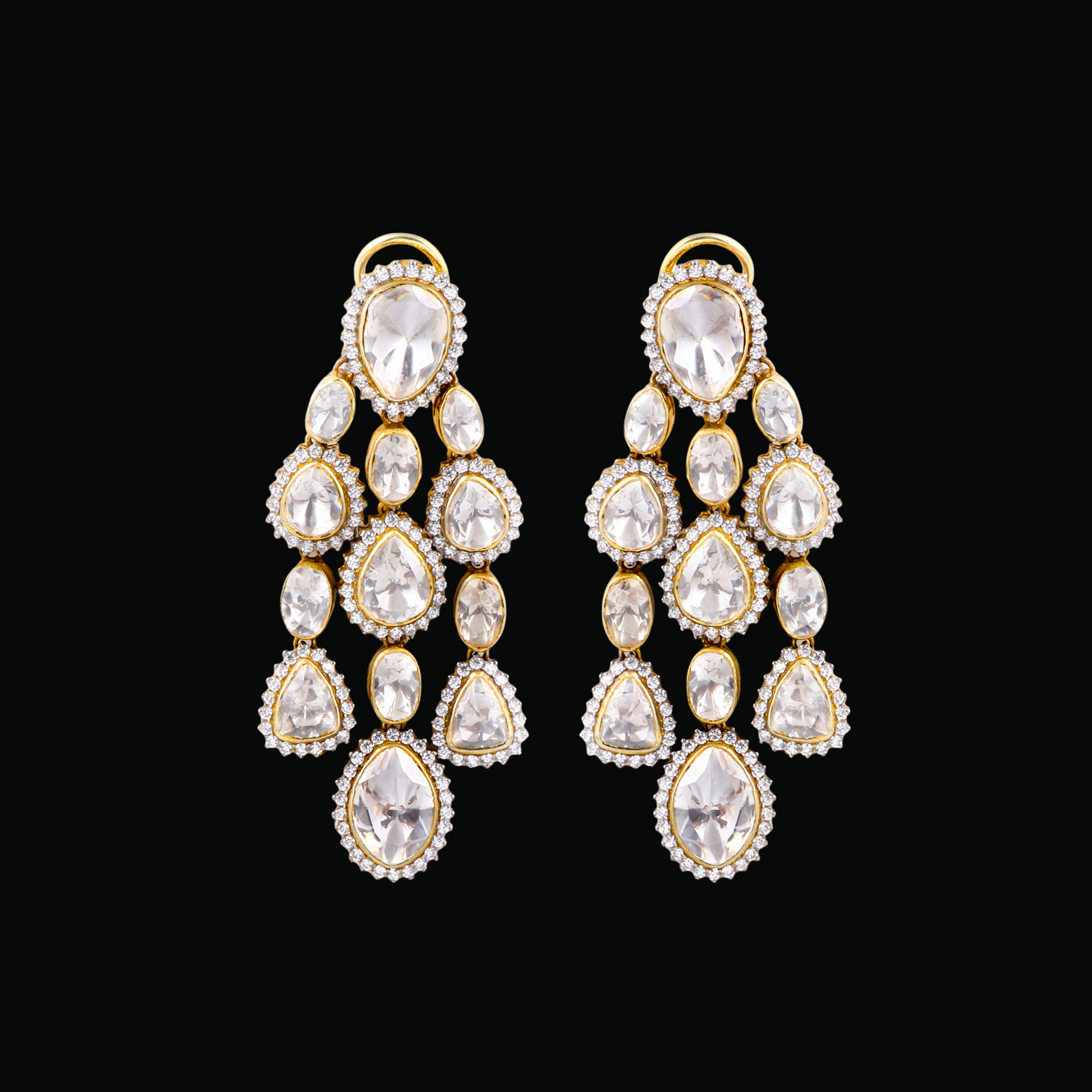 Handcrafted with radiant Moissanite Polki stones, this design features a stunning cascading arrangement of teardrop motifs set in a luxurious blend of 18K yellow and white gold rhodium. Each drop is intricately detailed, offering unmatched brilliance with a regal charm. Designed for all-day comfort, these earrings include additional back support to ensure secure wear at every celebration.